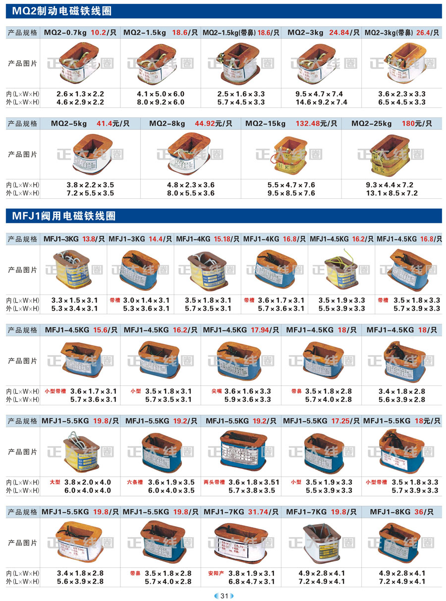 MZZ2、MZZ1直流電磁鐵線圈、MZD1直推式電磁鐵線圈、MFZ1制動電磁鐵線圈、QJ2、QJ3補(bǔ)償器、Q23、QZ610電磁閥、葫蘆線圈 ?