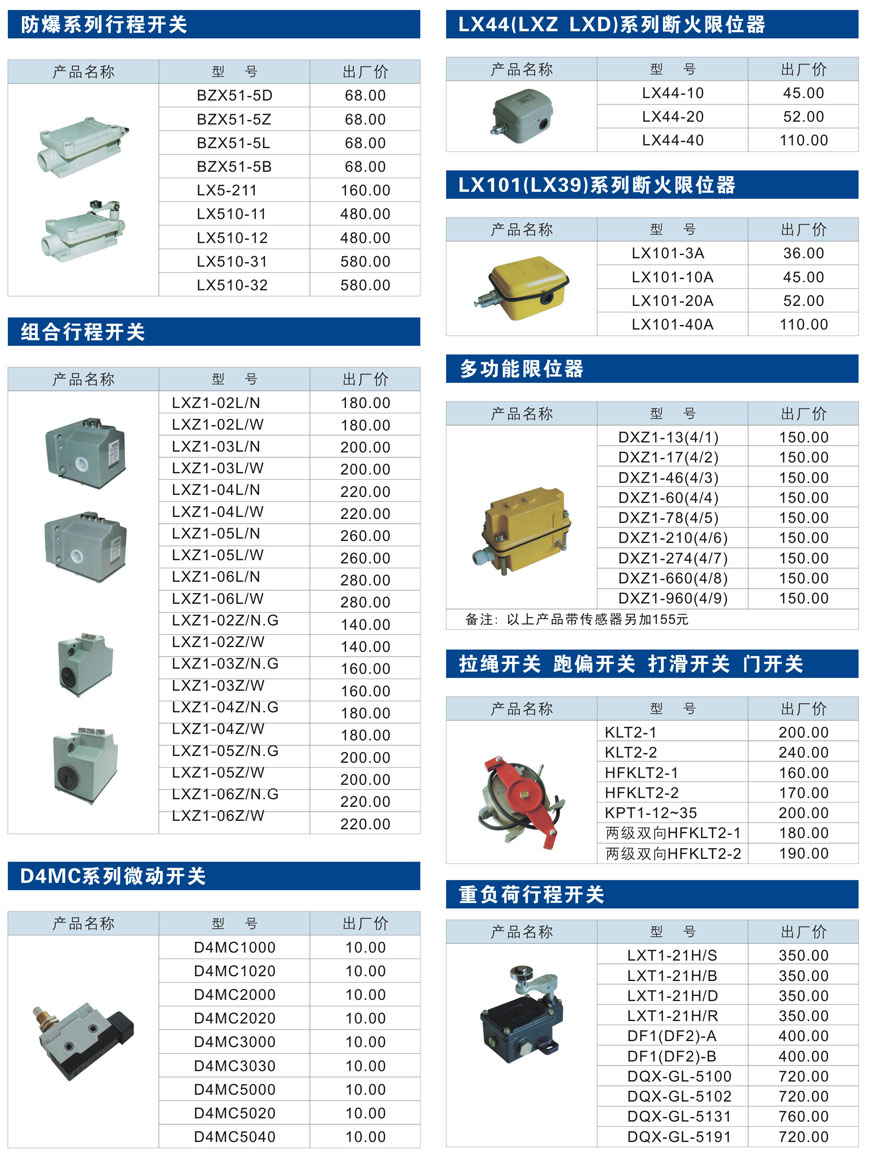 防爆系列行程開關、船用系列行程開關、組合行程開關、D4MC系列微動開關、LX44(LXZ LXD)系列斷火限位器、LX101(LX39)系列斷火限位器、多功能限位器、拉繩開關、跑偏開關 、打滑開關、門開關、重負荷行程開